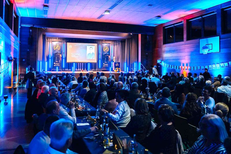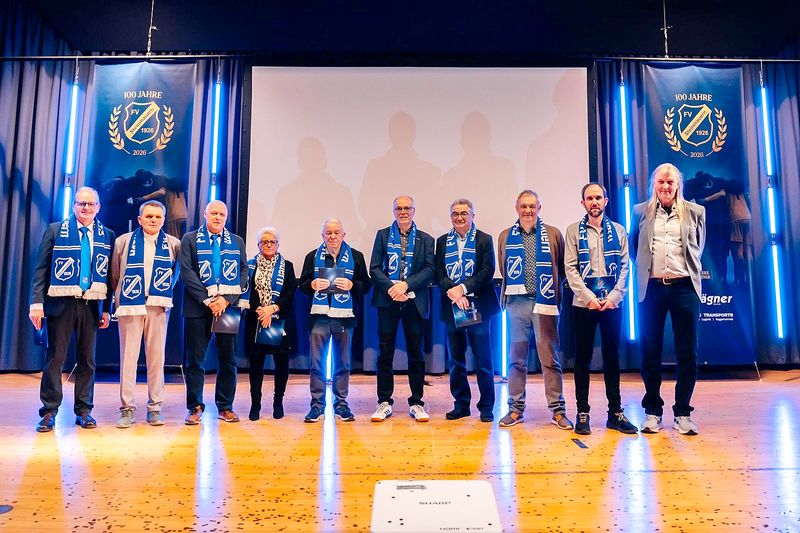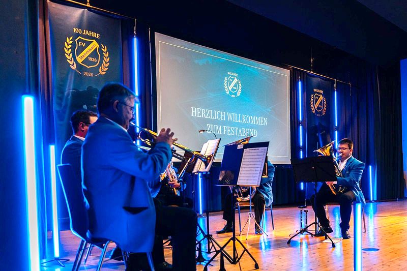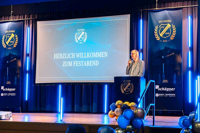 Mit einem großen Festabend hat der FV Steinmauern am 28. Februar 2026 sein 100. Jubiläum gefeiert. Das Deko-Team um Andrea Balke und Ruth Meisch hatte die Turnhalle in einen blau-weißen Ballsaal verwandelt.